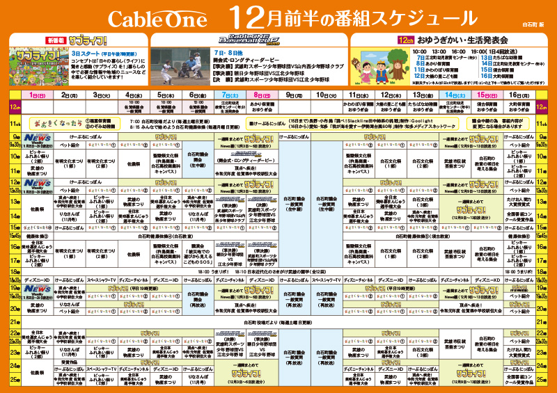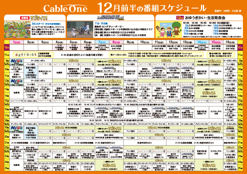 県民チャンネル1/CATV 018ch ・ 県民チャンネル2/CATV 019ch では、県内ケーブルテレビ局の番組を日替わりで放送しています。 (毎朝6時切替) ケーブルワンの番組は、県民チャンネル2/CATV 019chで、土曜日 朝6時から日曜日の午後1時までご覧頂けます。 ※過去放送分の内容等については、ケーブルワン 【TEL:0120-80-7511】へお問い合わせ下さい。 ※予告無く番組内容・放送時間などを変更する場合があります。ご了承下さい。 ※武雄市議会/江北町議会/白石町議会/佐賀県議会中継のため番組を変更することがあります。 下記番組表をクリックして頂くと、番組表を拡大してご覧頂けます。