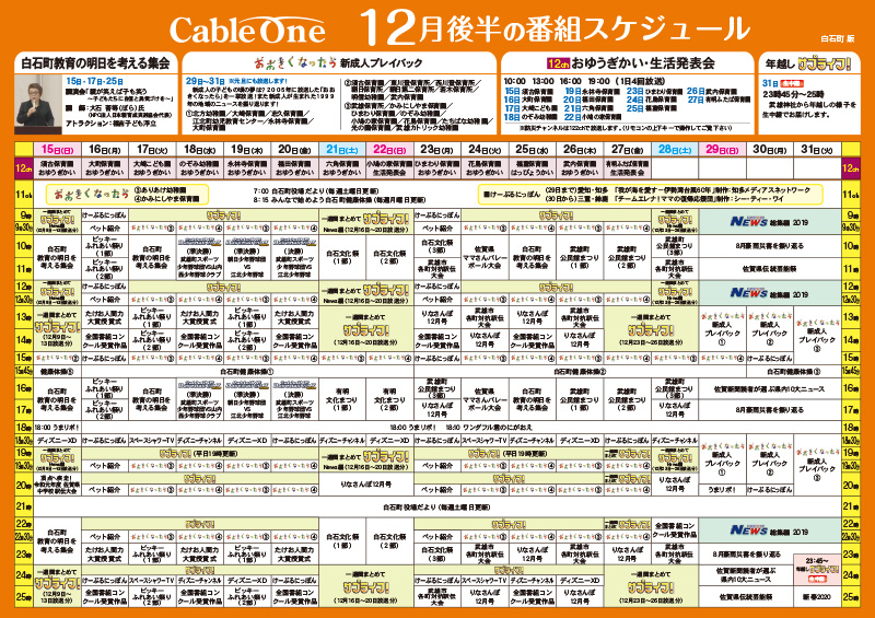 県民チャンネル1/CATV 018ch ・ 県民チャンネル2/CATV 019ch では、県内ケーブルテレビ局の番組を日替わりで放送しています。 (毎朝6時切替) ケーブルワンの番組は、県民チャンネル2/CATV 019chで、土曜日 朝6時から日曜日の午後1時までご覧頂けます。 ※過去放送分の内容等については、ケーブルワン 【TEL:0120-80-7511】へお問い合わせ下さい。 ※予告無く番組内容・放送時間などを変更する場合があります。ご了承下さい。 ※武雄市議会/江北町議会/白石町議会/佐賀県議会中継のため番組を変更することがあります。 下記番組表をクリックして頂くと、番組表を拡大してご覧頂けます。