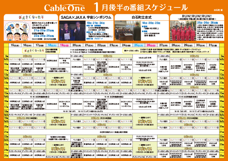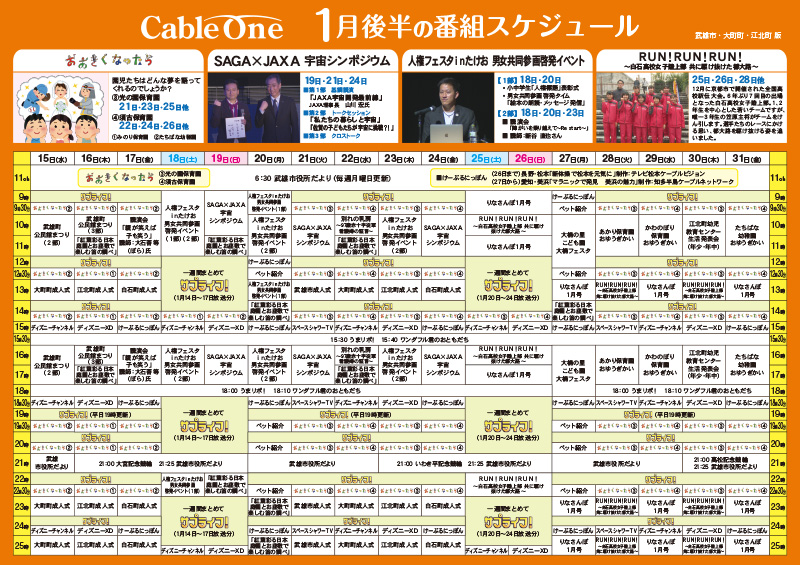 県民チャンネル1/CATV 018ch ・ 県民チャンネル2/CATV 019ch では、県内ケーブルテレビ局の番組を日替わりで放送しています。 (毎朝6時切替) ケーブルワンの番組は、県民チャンネル2/CATV 019chで、土曜日 朝6時から日曜日の午後1時までご覧頂けます。 ※過去放送分の内容等については、ケーブルワン 【TEL:0120-80-7511】へお問い合わせ下さい。 ※予告無く番組内容・放送時間などを変更する場合があります。ご了承下さい。 ※武雄市議会/江北町議会/白石町議会/佐賀県議会中継のため番組を変更することがあります。 下記番組表をクリックして頂くと、番組表を拡大してご覧頂けます。