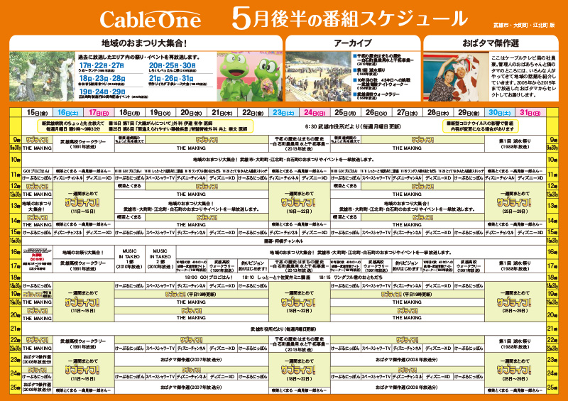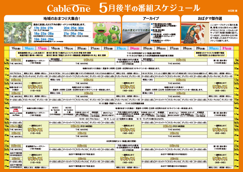 県民チャンネル1/CATV 018ch ・ 県民チャンネル2/CATV 019ch では、県内ケーブルテレビ局の番組を日替わりで放送しています。 (毎朝6時切替) ケーブルワンの番組は、県民チャンネル2/CATV 019chで、土曜日 朝6時から日曜日の午後1時までご覧頂けます。 ※過去放送分の内容等については、ケーブルワン 【TEL:0120-80-7511】へお問い合わせ下さい。 ※予告無く番組内容・放送時間などを変更する場合があります。ご了承下さい。 ※武雄市議会/江北町議会/白石町議会/佐賀県議会中継のため番組を変更することがあります。 下記番組表をクリックして頂くと、番組表を拡大してご覧頂けます。
