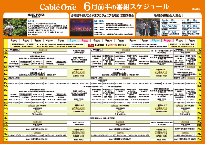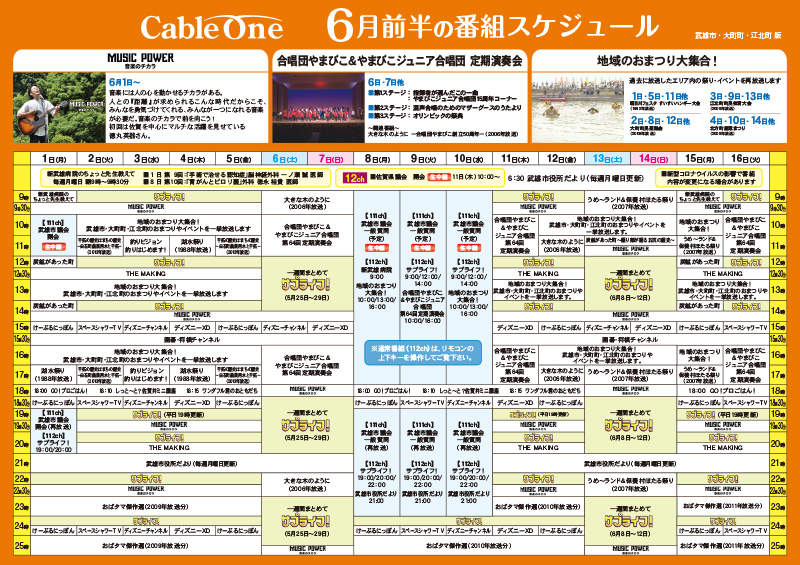 県民チャンネル1/CATV 018ch ・ 県民チャンネル2/CATV 019ch では、県内ケーブルテレビ局の番組を日替わりで放送しています。 (毎朝6時切替) ケーブルワンの番組は、県民チャンネル2/CATV 019chで、土曜日 朝6時から日曜日の午後1時までご覧頂けます。 ※過去放送分の内容等については、ケーブルワン 【TEL:0120-80-7511】へお問い合わせ下さい。 ※予告無く番組内容・放送時間などを変更する場合があります。ご了承下さい。 ※武雄市議会/江北町議会/白石町議会/佐賀県議会中継のため番組を変更することがあります。 下記番組表をクリックして頂くと、番組表を拡大してご覧頂けます。