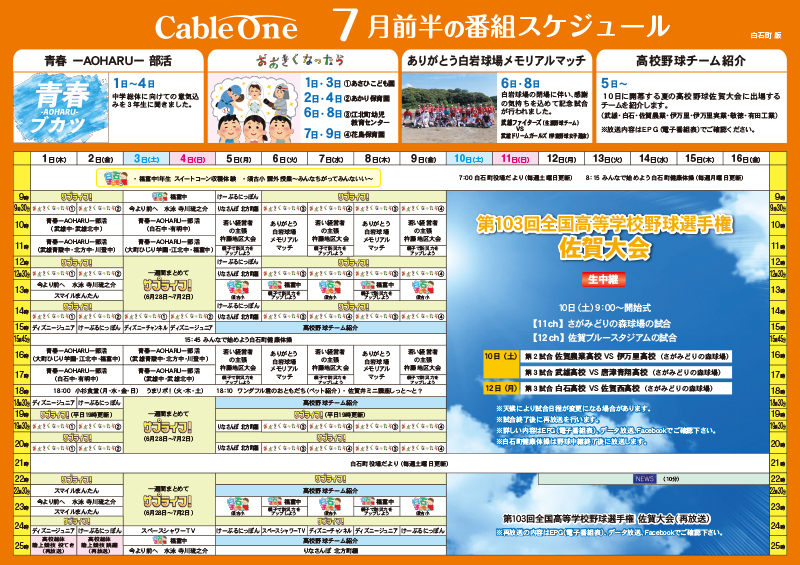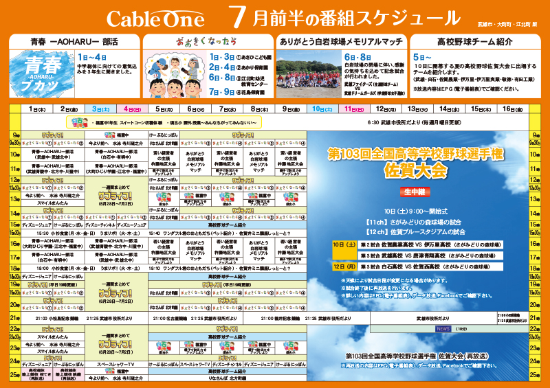 県民チャンネル1/CATV 018ch ・ 県民チャンネル2/CATV 019ch では、県内ケーブルテレビ局の番組を日替わりで放送しています。 (毎朝6時切替) ケーブルワンの番組は、県民チャンネル2/CATV 019chで、土曜日 朝6時から日曜日の午後1時までご覧頂けます。 ※過去放送分の内容等については、ケーブルワン 【TEL:0120-80-7511】へお問い合わせ下さい。 ※予告無く番組内容・放送時間などを変更する場合があります。ご了承下さい。 ※武雄市議会/江北町議会/白石町議会/佐賀県議会中継のため番組を変更することがあります。 下記番組表をクリックして頂くと、番組表を拡大してご覧頂けます。(PDFファイル) ※番組表を拡大して(PDFファイル)を閲覧いただくには、Adobe Acrobat Readerのインストールが必要です。