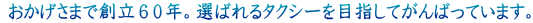 | 1・弊社の特徴 | ・弊社は佐賀県武雄市に於いて、創立60周年以上となるタクシー会社です。 武雄温泉の発展と共に観光・ビジネス・地域の足としてお客様に親しまれてまいりました。 (・創立 昭和18年10月1日・会社設立 昭和26年9月3日) ・県内はもとより長崎や福岡県等への利便性もあり、武雄市から各地への観光や空港送迎も数多くご利用いただいております。 また格安の佐賀空港⇔武雄温泉のリムジンタクシーも運行致しております。 ※有明佐賀空港リムジンタクシー ・また近年は福祉・介護事業にも力を入れ、福祉車両や乗務員のヘルパー2級終了者も10数名と県内トップクラスと充実しております。 ※訪問介護事業 ・路線バスの廃止、高齢者の方の増加等により、地域の足として地域の皆様や自治体様のご要望等もあって、乗合タクシーも運行いたしております。 ※みんなのバス ・禁煙タクシーも他社に先駆けて実施。また安全教育にも力を入れ、県内初のドライブレコーダーやエコドライブシステムも装備し事故撲滅を目指しております。 |